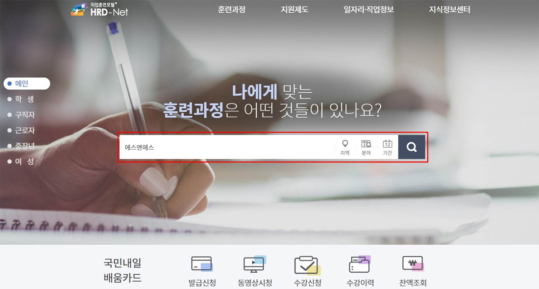 www.hrd.go.kr 홈페이지 접속(로그인)하여 에스앤에스를 검색합니다.