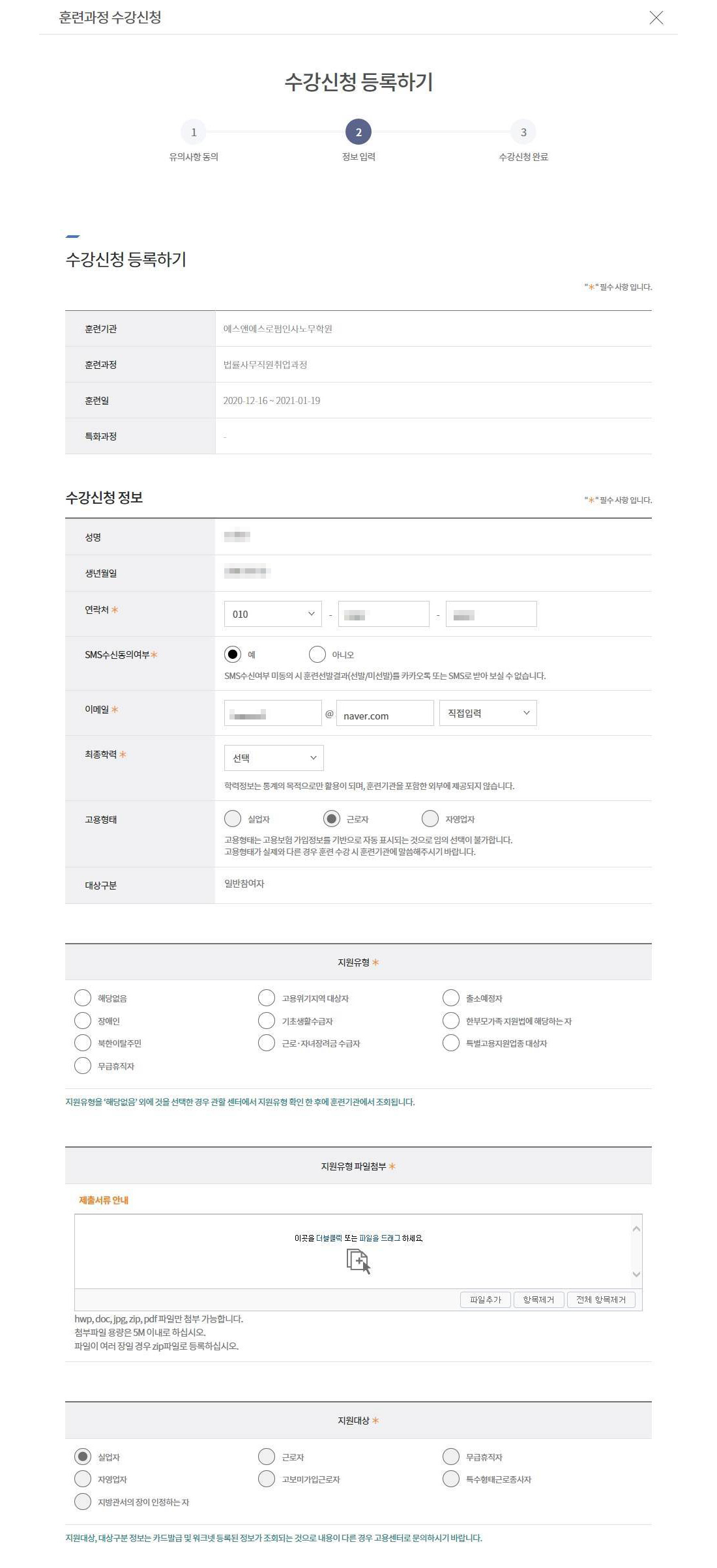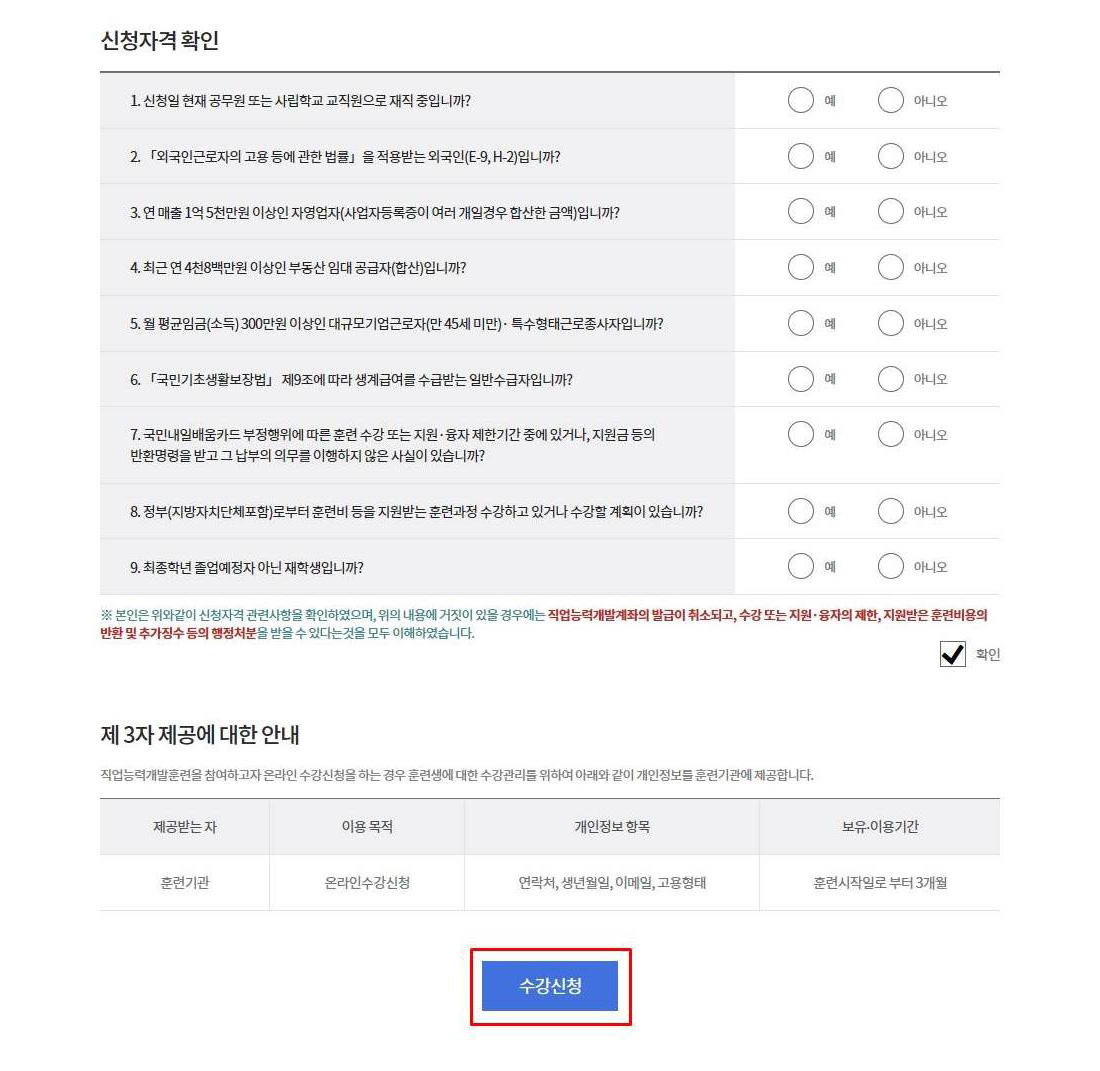 훈련과정 수강신청 정보를 입력합니다.